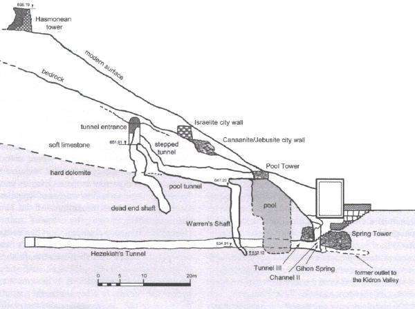 These verses from Isaiah show just how important that area beside the Gihon Spring was from a diplomatic point of view. The reason, undoubtedly, was because the Fountain Gate at the head of the stairs that led down to the Kidron, was the principal means of access to and from the City of David. It led not only to the important and frequently-used highway which ran the length of the Kidron valley, but gave direct access to the Gihon spring. It is important to notice that both of the above verses describe the water conduit as originating at the upper pool. That can only mean that the other end of the conduit must have emptied into a lower pool, one which would have served as a main water supply for the lower city. Often referred to simply as the Old Pool on maps of the city of David, it is now known as Birket el Hamra, and lies at the southern tip of the south-east ridge, although it is no longer used as a reservoir. A great deal of important archaeological work has been carried out in the area of Jerusalem that was once occupied by the City of David, and particularly on the ancient complex water system that directed the water away from the Gihon spring as that most vital water source gushed forth its vast quantities of pure spring water each time the deep subterranean siphon suddenly emptied itself through the spring�s crevice. Gill in 1991 argued that the waterworks were fashioned along the pre-existing tracks of a natural karst system of shafts and conduits formed by dissolution of the limestones and dolomites upon which Jerusalem is built (Gill 1991:1467, Gill 1996:20). Reich and Shukron, however, challenge this theory arguing such a natural crevice could not have existed in the rock (Reich and Shukron 2002:75). Upper Pool and the Two WallsOf primary interest is the Upper Pool itself. The elevation sectional drawing below shows the pool as an integral part of the Gihon water system with a depth about 46 feet. Only a small part of this pool has so far been cleared in the present excavation work, but with its surface on a level with the start of the dolomite, its entire depth lies within that hard, impervious bedrock. The water is fed into it just a few feet above its deepest part via a subsidiary rock-cut tunnel, known as Tunnel III, which leads off the main Siloam Tunnel (Tunnel II) about 20 feet from Gihon. The actual surface of the pool therefore lies about 44 feet above the level of the spring itself.