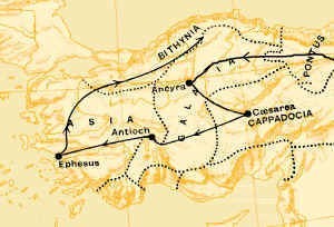 Silas personally carried the epistle (I Peter 5:12) addressed to the exiles. Prompted by the news of Paul�s martyrdom, the letter was one of encouragement. The epistle was the first such letter to be written by Peter to these churches (II Peter 1:1). John Mark, who sent his greetings in the epistle, was with Peter at the time of writing (I Peter 1:13). The brethren at Babylon also sent their greetings (I Peter 5:13). This suggests that Peter wrote the epistle at Babylon of Mesopotamia on the Euphrates, which was the main city from which the apostles in the east operated.F3 Similarly Paul, and the evangelists aiding him formerly used Antioch of Syria as their primary city (Acts 14:26). The order in which Peter names the provinces of Asia Minor, from east to west, further corroborates that the letter was sent from Babylon not Rome. The physical and political geography of the region suggests the route taken by a traveler in CE 68.