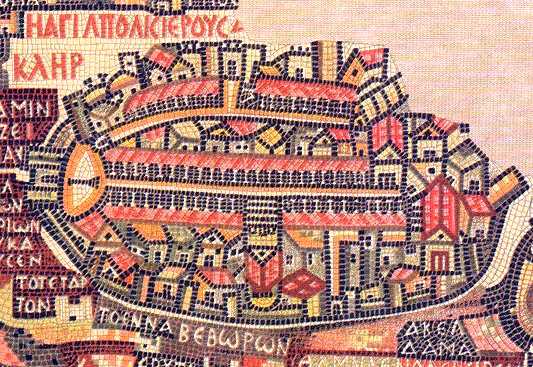 The moasic provides the earliest extant representation of Jerusalem. The map provides important details as to its 6th century landmarks. This map is one key in developing scholarly knowledge about the physical layout of Jerusalem after CE 70. We recommend you also consider the Jerusalem Old City Map for your collection. |